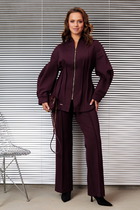 Костюм женский 2х предметный состоит из жакета и брюк, жакет выполнен из сочетания тканей: лен с напылением лаке и текстильное полотно. Жакет приталенный с ассиметричным V-вырезом горловины и лацканами. По полочке жакета расположены прорезные карманы- рамки. Рукав втачной длинный. Низ жакета фигурный, застежка- молния.Жакет на полной подкладке. Брюки классические прямые от бедра, на притачном поясе с резинкой, в боковых швах брюк расположены карманы с отрезным бочком, застежка- молния на гульфике.
