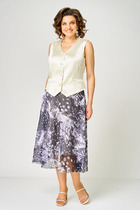 Комплект женский состоящий из блузона и брюк. Блузон прямого кроя с отрезной кокеткой по переду. Рукав приспущенный с манжетой по низу. Брюки высокой посадки с заложенными складками по линии талии и по низу. Изделие на широкой манжете по низу. По брючинам расположены накладные карманы.