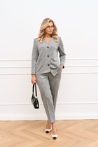 Костюм женский юбочный выполнен из джинсовой ткани, состоит из блузона и юбки карандаш в длине миди. Блузон прямого кроя с отрезной кокеткой  по переду декорированной бахромой, горловина- лодочка, рукав втачной длинный. Спинка изделия с глубоким V-образным вырезом  и имитацией застежки. Юбка зауженная к низу карандаш, в длине миди, имеет ассиметричные декоративные подрезы по передним и задним полотнищам. Юбка на притачном поясе и с застёжкой молния на гульфике, в  боковых швах имеются карманы.