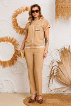 Костюм женский 2-предметный состоит из жакета и брюк, жакет выполнен из сочетания костюмных тканей. Жакет приталенный с ассиметричным V-вырезом горловины и лацканами. По полочке жакета расположены прорезные карманы- рамки. Рукав втачной длинный. Низ жакета фигурный, застежка- молния. Жакет на полной подкладке. Брюки классические прямые от бедра, на притачном поясе с резинкой, в боковых швах брюк расположены карманы с отрезным бочком, застежка- молния на гульфике.