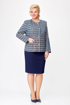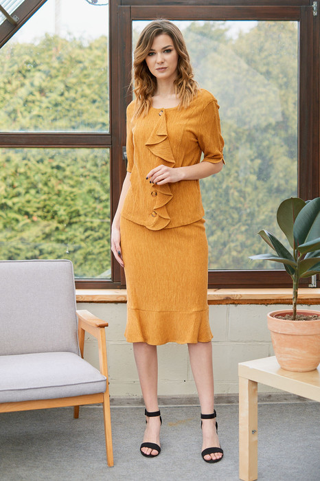 Комплект 2-х предметный, состоящий из блузона и юбки. Блуза без воротника с круглым вырезом горловины и центральной застёжкой на пуговицы, декорирована притачным воланом. Рукав  и спинка с декоративным разрезом. Юбка прямая с притачным поясом  и застежкой по центру спинки на молнию. По низу юбки притачной волан, по среднему шву спинки разрез. Длина блузон по спинке 54 см. Длина рукава 31 см. Длина юбки 70 см.