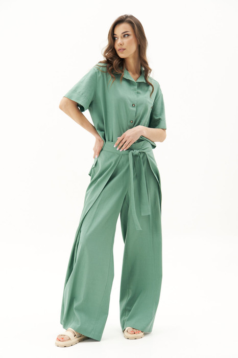 Брючный комплект всегда смотрится эффектно и дорого. Свободная, упрямлённая рубашка и брюки в расслабленном стиле. Покрой - рубашечный, воротник классический рубашечный, застёжка центральная. Спинка с отрезной кокеткой и мягкими складками. Брюки прямого силуэта, на молнии в боковом шве. В передних полотнищах брюк по переду в боковых швах вставлены детали иммитирующие запах, прикрывающие высокий разрез. Брюки с поясом-завязкой по переду."