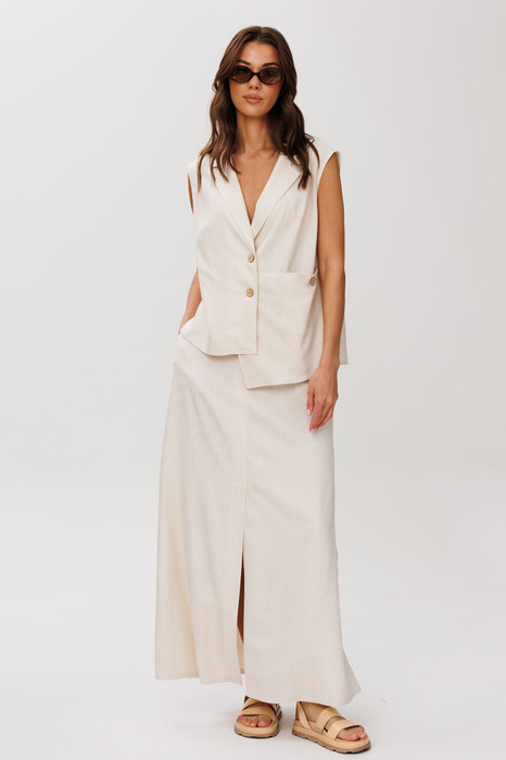 Костюм с жилетом - прекрасное решение для смелых экспериментов. Выполненный в нейтральной цветовой гамме, он позволяет дополнять себя различными аксессуарами и создавать каждый раз новые актуальные образы. Жилет прямого силуэта с центральной застёжкой и фигурным разноуровневым бортом. Спинка с декоративной разноуровневой планкой, которая имитирует застежку.