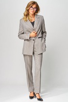 Брюки свободные, на притачном эластичном поясе в области спинки и цельнокроеном спереди. Застёжка по боковому шву на потайную молнию, петлю и пуговицу. Передние половинки брюк с отлетной деталью, оригинально драпирующейся в области талии.