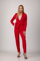 Длина рукава с плечом около 74 см. Брюки покроя ""barrel"", расширенные в области икры и зауженные к низу. Пояс притачной, эластичный в области спинки. По передним половинкам брюк-застежка и боковой наклонный карман. По задним-вертикальный шов. Боковой шов смещен в сторону центра передних половинок брюк. По низу-пата с регулирующими пуговицами, позволяющая создавать разную ширину брюк внизу.