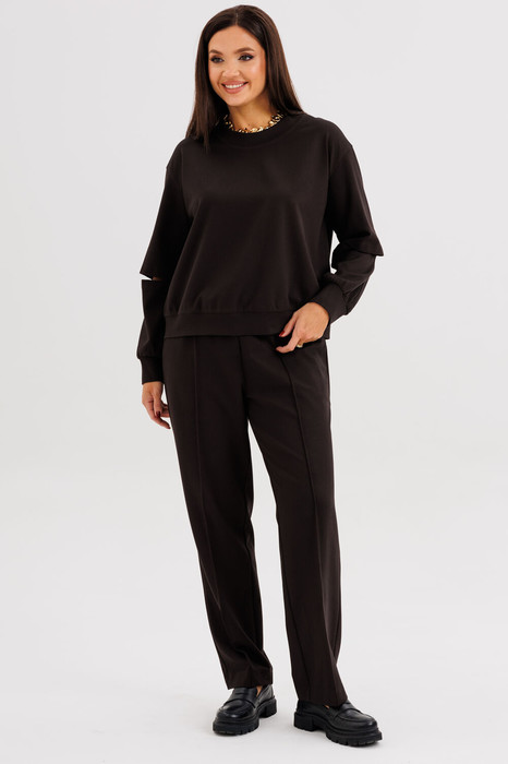 Свободный оверсайз свитшот с заниженной линией плеча, рукавом расширенным в области оката. По низу изделия и рукавов - притачной эластичный манжет. Рукав из 4-х частей с эффектным разрезом в области локтя.