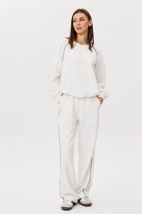 Спортивный костюм не предназначенный для занятия спортом, эдакая разновидность спортивной одежды в современной моде, выражающая характерную для спорта эстетику с помощью динамического кроя и отделки. Свободный свитшот покроя реглан с отделочными контрастными кантами по линии притачивая рукава и брендовой вышивкой на полочке.