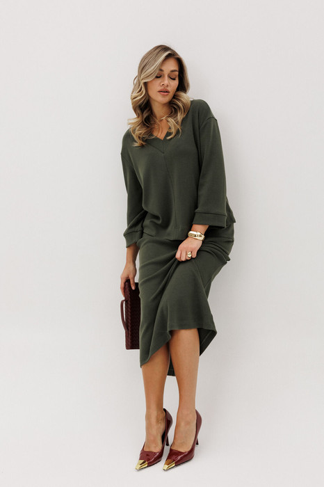Свободный упрямлённый джемпер с заниженной линией плеча, V-образным вырезом и рукавом длиной 7/8. По горловине и низкам рукавов - отделочные полоски.