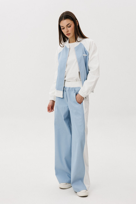 Широкие брюки придают образу трендовую выразительность и свободу движений, а свежий голубой оттенок добавляет легкости и визуальной чистоты. Комплект легко комбинируется с базовыми футболками, топами и кедами, создавая стильные повседневные образы.