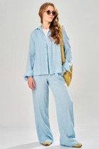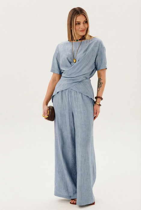 Этот стильный костюм — воплощение летней элегантности и комфорта. Модель выполнена из вискозной ткани с эффектом жатки, что не только актуально в этом сезоне, но и крайне практично: одежда меньше мнется и сохраняет безупречный вид в течение всего дня.