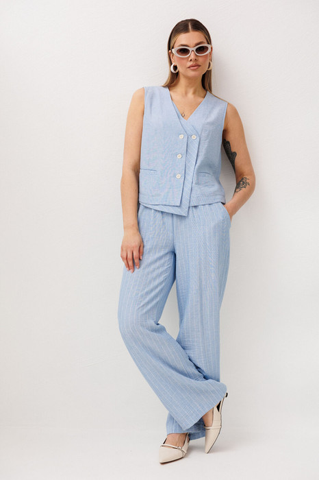 Жилет на пуговицах создает аккуратный, собранный силуэт, а свободные широкие брюки дарят ощущение легкости и свободы движений. Мягкий голубой оттенок и деликатная вертикальная полоска делают образ свежим, женственным и визуально вытягивают фигуру.