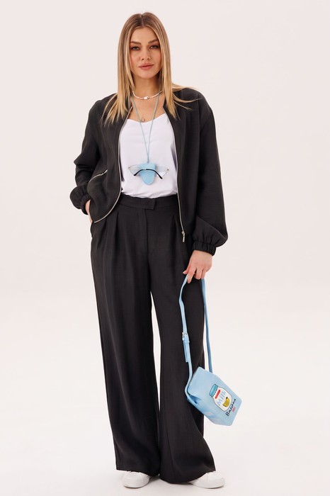 Жакет придаёт образу расслабленную элегантность и комфорт, а широкие брюки визуально вытягивают силуэт и обеспечивают свободу движений. Продуманный крой делает модель удобной и универсальной для разных типов фигуры.