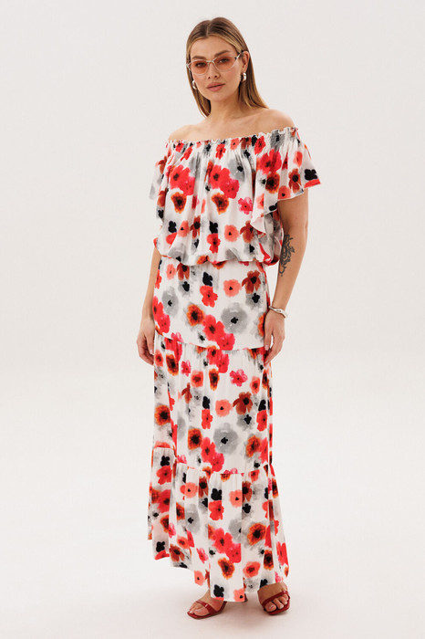 Юбка А-образного силуэта, состоит из трёх горизонтальных воланов с лёгкой сборкой и на эластичном поясе.