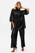 Брюки дополняют ансамбль своей продуманной конструкцией: плотный трикотаж обеспечивает тепло и форму, лампас вдоль бокового шва — визуальную вертикаль, вытягивающую силуэт. Эластичный пояс и аккуратный подгиб низа с открытым срезом придают изделию современный характер, а карман в боковом шве добавляет функциональности.