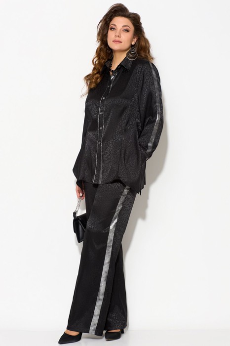 Необычный красивый комплект ""Русалия"" состоит из нарядной блузки и брюк. Блузка без подкладки, ткань мягкая, приятная к телу, присутствует леопардовый сатиновый рисунок. Это стильная блузка полуприлегающего силуэта, эффектом блузки является отделка из  сатиновой серебристой ткани. Застежка в блузке однобортная: одна планка из отделочной сатиновой серебристой ткани, вторая планка из основной леопардовой ткани, в шов вставлен кант из отделочной ткани. Воротник рубашечного типа со стойкой, по краю воротника кант. По полочке блузки рельефы, по бокам подрезы, расклешенные к низу. По спинке блузки  - отрезная кокетка и рельефы. Рукав втачной с лампасом из отделочной ткани. По низу рукава - манжет с застежкой на две пуговицы. Низ изделия обработан швом в подгибку с закрытым срезом.