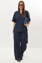 Женский брючный комплект "Магрита" выполнен из текстильной ткани "Нотус" и состоит из брюк и рубашки. Этот комплект выполнен из натуральных тканей (хлопка и льна), а также для эффекта создания легких полосочек используется во составе нейлон.