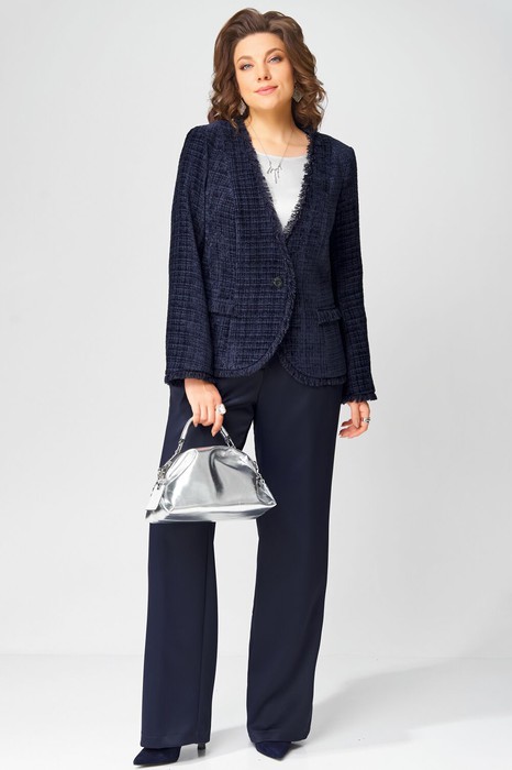 Жакет из твидовой ткани на подкладке, полуприлегающего силуэта. Однобортная застёжка на пуговицу, рельефные линии по полочке и спинке, декоративная трепка по борту, низу и рукавам создают фактурный акцент. Карман-обманка добавляет стильную деталь.