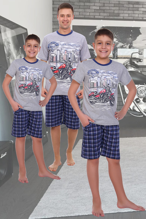 Удобный и практичный вариант одежды, очень приятный к телу. Костюм состоит из футболки и удлинённых шорт, не стесняющий движения. Футболка с современным принтом - мотоцикл на фоне Нью Йорка