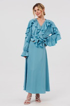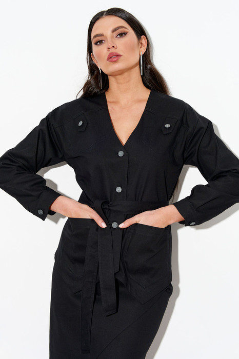 Джинсовый женский костюм без подкладки с юбкой и жакетом. Жакет свободного силуэта с V-образным вырезом горловины и рукавами со спущенной линией плеча; по переду сверху имитация карманов с декоративной патой, снизу функциональные накладные карманы; линия низа с фигурными углами. Юбка полуприлегающего силуэта "на запах" с завышенной линией талии и притачным поясом, по спинке которого вставлена резинка; в боковом шве застежка на молнию, петлю и пуговицу. Материал при правильном уходе не теряет своих свойств.