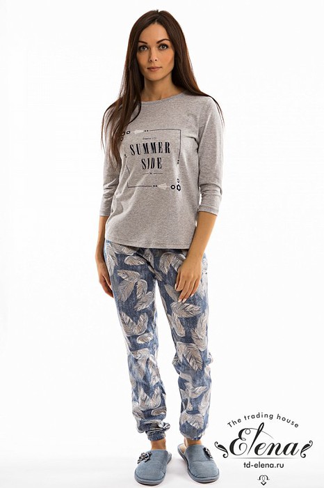 Костюм из кулирки, 100% хлопок. Футболка однотонная, с круглым вырезом горловины, спереди расположен принт. Втачной рукав длиной 3/4. Брюки на резинке сверху и снизу, с боковыми карманами.
