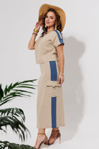 Данный комплект выполнен из мягкого трикотажного полотна, идеально подойдёт для демисезонного периода, благодаря натуральному составу в нём будет тепло но не жарко.Свитшот свободного кроя с длинными рукавами и спущенным плечом, предаёт образу мягкость и непринуждённость.Горловина выполнила из отделочной ткани в "рубчик"что является очень функциональным и стильным элементом.Юбка прямая, на подкладке, на поясе, слегка зауженная к низу. Длина ниже линии колена. Средний шов юбки заканчивается шлицей.
