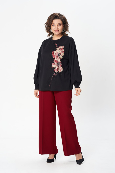 Комплект из джемпера и брюк. Джемпер свободного силуэта из трикотажной ткани с принтом. Рукав втачной одношовный со складками по низу и манжетой. Горловина обработана планкой. По переду поверх принта настрочена сетка с бархатным рисунком. Брюки расширеные книзу с притачным поясом. Спереди застежка гульфик на молнии и петлей и пуговицей по поясу. По задней частям брюк вытачки. Пояс срезинкой в боковых частях. Брюки с заутюженными стрелками. Длина джемпера - 66 см, длина рукава джемпера - 53 см, длина брюк с учетом пояса - 109 см.