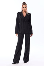 Костюм состоит из жилета и брюк, выполеных из костюмной ткани. Жилет полуприлегающего силуэта  с воротником пиджачного типа.  Перед с рельефами, талиевой вытачкой и декоративным клапаном.  Застежка центральная однобортная на 2 петли и пуговицы. Спинка со средним швом и рельефами. Вдоль оката рукава выполнена декоративная планка. К жилету прилагается тонкий пояс из основной ткани.  Брюки расширеные книзу с притачным поясом. Спереди застежка гульфик на молнии и с петлей и пуговицей по поясу. По задней частям брюк вытачки. В боковых швах карманы с наклонным входом. По поясу широкие шлевки. Брюки со срелками застроченными по переду и заутюженными сзади. Длина жилета - 71 см, длина брюк с учетом пояса - 109 см.