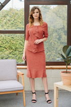 Костюм сотоит из рубашки и брюк. Рубашка свободного силуэта из легкой вискозной ткани под лен. Застежка центральная на петли и пуговицы, воротник на стойке.  В боковых швах разрезы. Рукав втачной рубашечного кроя. Карманы спереди и вставка вдоль плеча и рукава выполнеы из кружева. Брюки прямые с поясом на резинке. Спереди имитация застежки гульфик. В боковых швах карманы.  Длина брюк - 109 см, длина рубашки-  71 см, длина рукава рубашки - 35 см.