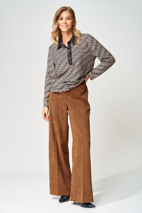 Джемпер прямого силуэта с воротником поло из плотной хлопковой ткани "двухнитка". Рукав втачной одношовный. По низу изделия, по низу рукава и по воротнику проложена отделочная строчка. Брюки палаццо с притачным поясом из мягкой вельветовой ткани. Спереди застежка гульфик на молнии и петлей и пуговицей по поясу. По задней частям брюк вытачки. Пояс с резинкой в боковых частях. Брюки с заутюженными стрелками. Длина джемпера- 66 см, длина рукава - 60 см. Длина брюк с учетом пояса - 109 см.