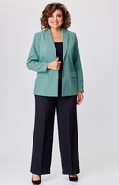 Костюм состоит из джемпера и брюк. Джемпер приталенного силуэта с воротником поло из трикотажного полотна. Рукав втачной одношовный. Брюки палаццо с притачным поясом из мягкой вельветовой ткани. Спереди застежка гульфик на молнии и петлей и пуговицей по поясу. По задней частям брюк вытачки. Пояс с резинкой в боковых частях. Брюки с заутюженными стрелками. Длина брюк с учетом пояса - 109 см. Длина джемпера - 57 см, длина рукава - 60 см.