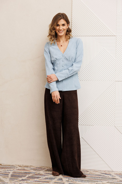 Костюм состоит из блузки и брюк. Блузка оригинальная приталенного силуэта из вельветовой ткани. Перед с подрезом под грудью, сборкой в районе груди и талиевыми вытачками. Затсежка на петли и пуговицы. Горловина V-образной формы. Спинка со средним швом и талиевыми вытачками. Рукав втачной со сборкой по окату и с манжетой по низу. Манжета высокая с двумя петлями и пуговицами. Длина блузки - 63 см, длина рукава блузки - 64 см. Брюки палаццо с притачным поясом из мягкой вельветовой ткани. Спереди застежка гульфик на молнии и петлей и пуговицей по поясу. По задней частям брюк вытачки. Пояс с резинкой в боковых частях. Брюки с заутюженными стрелками. Длина брюк с учетом пояса - 109 см.