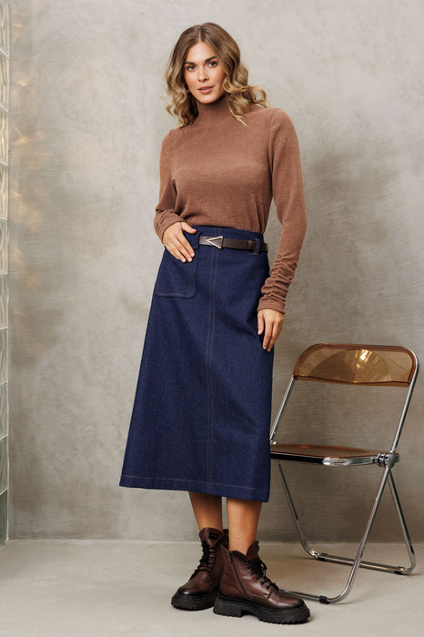 Костюм состоит из джемпера и юбки. Джемпер прилегающего силуэта из трикотажного полотна. Горловина стойка. Рукав втачной со сборкой на резинку по вертикали в нижней части. Юбка А-образного силуэта из плотного джинса. Передняя часть юбки со средним швом. С правой стороны вверху настрочен карман с клапаном- шлевкой. Задняя часть юбки со средним швом и вытачками. Сверху в среднем шве обработана потайная молния. Вдоль линии пояса настрочены шлевки. Пояс цельнокроеный на обтачке. Юбка на подкладке.  Вдоль среднего шва по переду и по периметру кармана проложена декоративная строчка. К юбке прилагается сьемный ремень. Фурнитура может быть изменена с охранением художественного замысла. Длина джемпера - 60 см, длина рукава - 60 см, длина юбки - 78 см.
