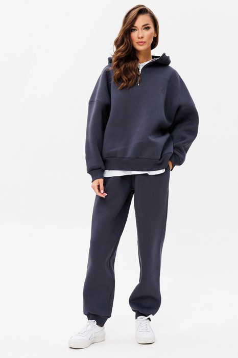 " Этот спортивный костюм от GOwear отлично подойдет для дома, прогулок, путешествий и отдыха. Сделан из теплой, комфортной ткани. Состоит из джемпера и брюк. Джемпер имеет  двойной капюшон и короткую застежку - молнию черного контрастного цвета по центру переда. На переде с левой стороны выполнена вышивка в цвет ткани. Джемпер имеет прямой силуэт. Низ джемпера и манжеты выполнены из кашкорсе.  Брюки зауженные к низу с притачным поясом (резинка и шнурок внутри). Брюки с боковыми карманами. По низу брюк – манжеты.