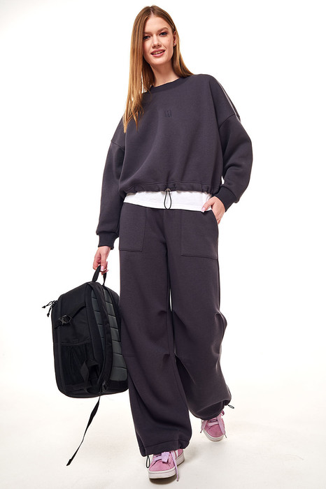 Современный комфортный костюм, состоит из брюк карго и укороченного свитшота. Отлично подойдёт для дома, прогулок, путешествий и отдыха. Пошит из теплой, комфортной ткани. Свитшот покроя оверсайз со спущенной линией плеча. Горловина, манжеты рукавов выполнены из ткани-компаньона кошкорсе. По центру переда вышивка-логотип в цвет ткани. Свитшот с кулисой по низу с резинкой внутри и фиксатором по центру переда, что позволит зафиксировать свитшот на талии. Брюки расширенные к низу, с возможностью заузить и зафиксировать ширину внизу (низ имеет кулиску с резинкой и фиксатором). На передних половинках брюк удобные накладные карманы, складки в районе линии колен. Пояс из ткани компаньена кошкорсе со шнуром и резинкой внутри.
