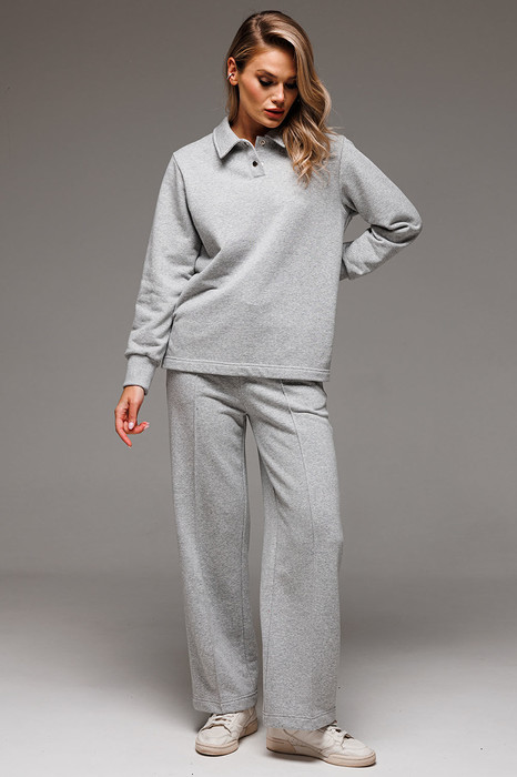 Для очаровательного образа не хватает воротничка! Воротник и застежка поло - маленькая деталь, которая «смягчает» и делает нежным весь аутфит. Брюки со стрелками добавят образу строгости и деловитости, что позволит носить костюм как на прогулки, так и в офис. Пошит из комфортной ткани - футера 3-нитки без начеса.
