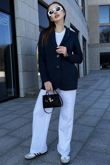 Костюм Gowear из футера в стиле smart casual поможет создать в меру строгий и одновременно расслабленный образ. Костюм состоит из жакета и прямых брюк. Жакет прямого силуэта с воротником и лацканами, имеет удобные карманы и застежку на 2 пуговицы. На левом лацкане вышивка-логотип в контрастном цвете. Низ и борта имеют открытые края (эффект необработанного шва), укреплены дополнительной строчкой. Жакет без подкладки. Брюки прямые. На передних половинках - отделочная строчка по стрелкам и удобные боковые карманы. Пояс из ткани кошкорсе, с резинкой и контрастным шнурком.