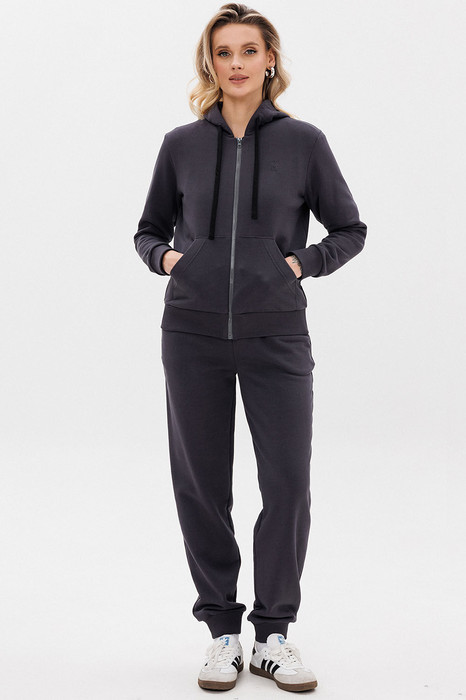 Классический женский спортивный костюм состоит из худи на застёжке-молнии и брюк на манжетах. Всесезонная ткань сделает его любимым в Вашем гардеробе как для дома, так и улицы.