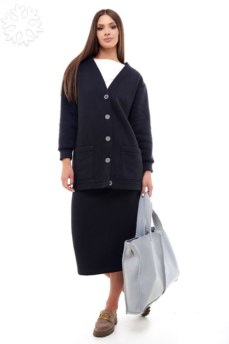 Современный женственный комплект, состоит из кардигана и прямой юбки. Кардиган имеет прямой силуэт и длинные рукава с мажетами (из ткани кошкорсе). Вырез горловины Y-образной формы с притачной планкой. Застежка по центру переда на петли и пуговицы. На переде удобные карманы. По планкам, по карманам, проложена отделочная строчка. Юбка зауженная к низу, облегающая фигуру, длиной миди. В среднем шве спинки разрез. Пояс из ткани кошкорсе, с резинкой внутри.