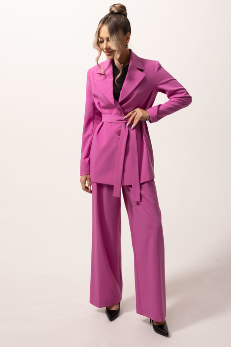Жакет с центральной застежкой на петли и пуговицы, втачным воротником и отложными лацканами пиджачного типа. По боковым швам со шлевками для съемного пояса. Брюки с отрезным поясом, на поясе расположены шлевки. Передние половинки с карманами, двумя односторонними складками, вход в карман наклонный к боковому шву. Застежка гульфик.