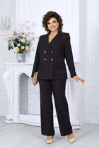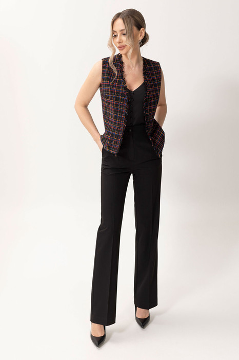 Жилет с центральной застежкой на петли и пуговицы, без воротника, с V-образным вырезом горловины. Горловина и край борта декорированы бахромой из основной ткани.. По переду с нагрудными вытачками. Спинка с талиевыми вытачками. Брюки- с отрезным поясом, на поясе расположены шлевки. По спинке пояс присборен на резинку. По боковым швам расположены карманы.  Вход в карман наклонный к боковому шву. Застежка гульфик.