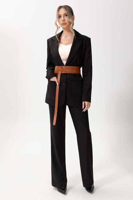 Жакет с центральной застежкой на петли и пуговицы, втачным воротником и отложным лацканом пиджачного типа. По переду нагрудные вытачки и накладные карманы. Спинка со средним швом. Брюки- с отрезным поясом, на поясе расположены шлевки. По спинке пояс присборен на резинку. По боковым швам расположены карманы.  Вход в карман наклонный к боковому шву. По передним половинкам, по шву притачивания пояса- односторонние складки. Застежка гульфик. Комплект со съемным поясом.