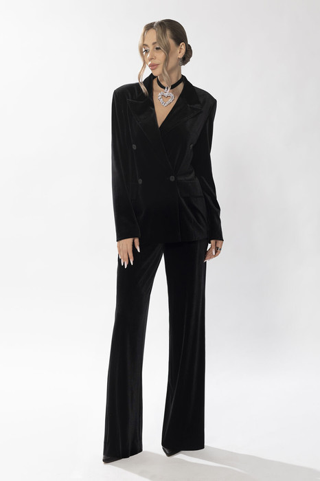 Жакет прямого силуэта с центральной двубортной застежкой на петли и пуговицы, с втачным воротником и отложными лацканами пиджачного типа. По переду с рельефами, выходящими из проймы. На уровне линии талии расположены настрочные клапаны. Спинка со средним швом, рельефами, выходящими из проймы. Рукав втачной, длинный. Брюки прямые, с отрезным поясом. По спинке и частично по переду пояс присборен на резинку.