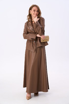 Жакет прямого силуэта с центральной застежкой на петли и пуговицы, без воротника, с круглым вырезом горловины. По переду с нагрудными вытачками. На уровне груди и линии талии расположены настрочные клапаны . Спинка со средним швом. Рукав втачной, длинный. Брюки прямые, с отрезным поясом и шлевками. В области спинки пояс присборен на резинку. На передних половинках расположены две односторонние складки и карманы. Вход в карман наклонный к боковому шву. Застежка гульфик.