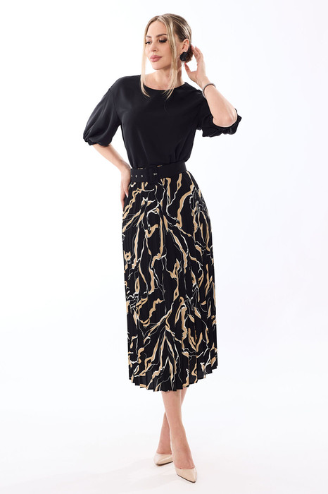 Блузка, без воротника, с круглым вырезом горловины, застежкой на потайную молнию в среднем шве спинки. По переду с нагрудными вытачками. По спинке со средним швом. Рукава с отрезной манжетой, присборенной на резинку. Плечо спущенное. Юбка, с отрезным поясом, застежкой на потайную молнию в левом боковом шве. Юбка плиссированная со складками гофре. Комплект со съемным поясом.
