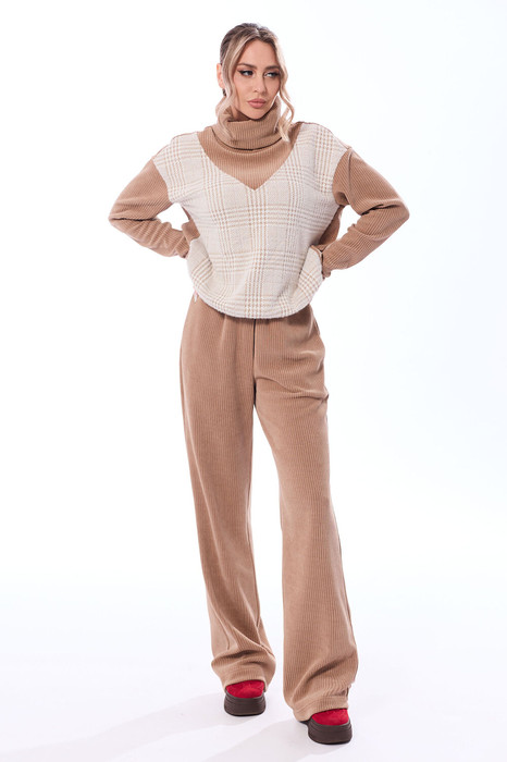 Блузон с высоким отрезным воротником- хомут. По переду с отрезной V- образной кокеткой. Спинка цельная. По низу блузона- кулиса со шнуром. Рукав втачной, длинный Плечо- спущенное. Брюки прямые, с отрезным поясом. Пояс присборен на резинку. В боковых швах расположены карманы.