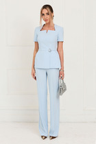 Жакет с застежкой на потайную молнию в среднем шве спинки, без воротника, с фигурным вырезом горловины. Жакет с отрезной баской с запахом по переду. По верхней части переда- асимметричный средний шов, заканчивающийся разрезом по горловине, фигурная кокетка, рельефы, выходящие из проймы, талиевые вытачки. Спинка со средним швом, рельефами, выходящими из проймы, талиевыми вытачками. Рукав втачной, короткий. Брюки с отрезным поясом, на поясе расположены шлевки. Пояс в области спинки присборен на резинку. Застежка гульфик.