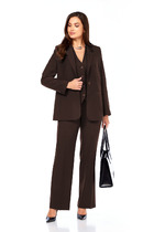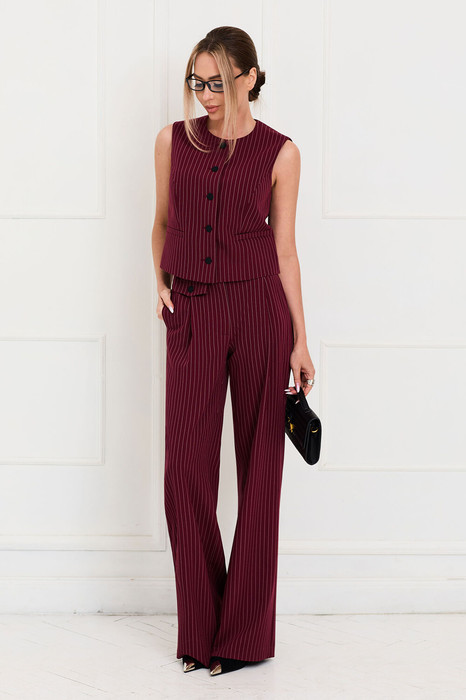 Жилет с центральной застежкой на петли и пуговицы, без воротника, с круглым вырезом горловины. По переду с рельефами, выходящими из проймы, прорезными карманами- имитацией с листочками. Спинка со средним швом, рельефами, выходящими из проймы. Брюки с отрезным поясом, на поясе расположены шлевки. Пояс в области спинки присборен на резинку. В боковых швах расположены карманы. Застежка гульфик.