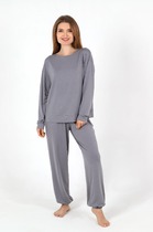 Жакет с центральной двубортной застежкой на пришивные кнопки, без воротника с отложными лацканами. По переду с рельефами, выходящими из проймы, талиевыми вытачками. Спинка со средним швом, рельефами, выходящими из проймы, талиевыми вытачками. Рукав втачной, длинный. Брюки с отрезным поясом, на поясе расположены шлевки. В боковых швах расположены карманы. Вход в карман наклонный к боковому шву. Застежка гульфик. Пояс в области спинки присборен на резинку. Костюм со съемным декоративным поясом. Декоративный пояс из кожзама, декорирован бахромой.