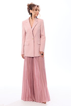 Жакет с центральной застежкой на петли и пуговицы, без воротника, с втачным воротником и отложными лацканами пиджачного типа. На уровне линии талтт расположены прорезные карманы с клапанами и двумя обтачками. По переду с фигурными подрезами, рельефами и талиевыми вытачками. По спинке со средним швом, рельефами, выходящими из проймы. Рукав втачной, длинный. Брюки- гофре расширенного силуэта, с отрезным поясом, без застежки, верх брюк присборен на резинку. Брюки без боковых швов.