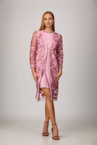 Жакет двубортный, приталенного силуэта. Вырез горловины V-образный, рукав спущенный, баллон на резинке по низу. По переду и спинке выполнены рельефы. Изделие на подкладке, с застежкой на петли и пуговицы по переду. Декором являются вышитые пайетки на ткани.